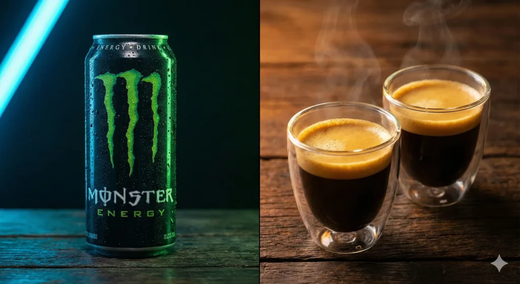 Aquí es donde la mayoría de las guías se equivocan. Matemáticamente, un Monster equivale a 2 tazas de café pequeñas o a un café de filtro grande y cargado.